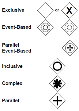 복잡한 게이트웨이는 다른 게이트웨이와 달리 내부 상태가 있으며, 이는 부울 인스턴스 속성 waitingForStart로 표시되며, 이는 초기에 true이고 활성화 후 false가됩니다. 이 속성은 나가는 시퀀스 흐름의 조건에서 사용되어 활성화시 토큰이 생성되는 위치와 재설정시 토큰이 생성되는 위치를 지정할 수 있습니다. 나가는 각 시퀀스 흐름은 활성화 또는 재설정시 토큰을 얻지 만 둘 다받는 것이 좋습니다. 적어도 하나의 나가는 시퀀스 흐름은 활성화시 토큰을 받아야하지만 토큰은 재설정시 생성되지 않아야합니다.