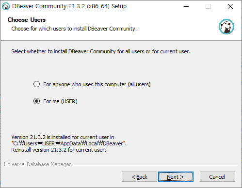 3. DBeaver를 다시 설치하는데 전체 사용자 설치 말고 현재 사용자 설치로 계속 진행한다.