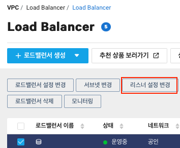 로드밸런서 관리 창에서 적용하고자 하는 로드밸랜서를 선택한 후 리스너 설정 변경을 한다.